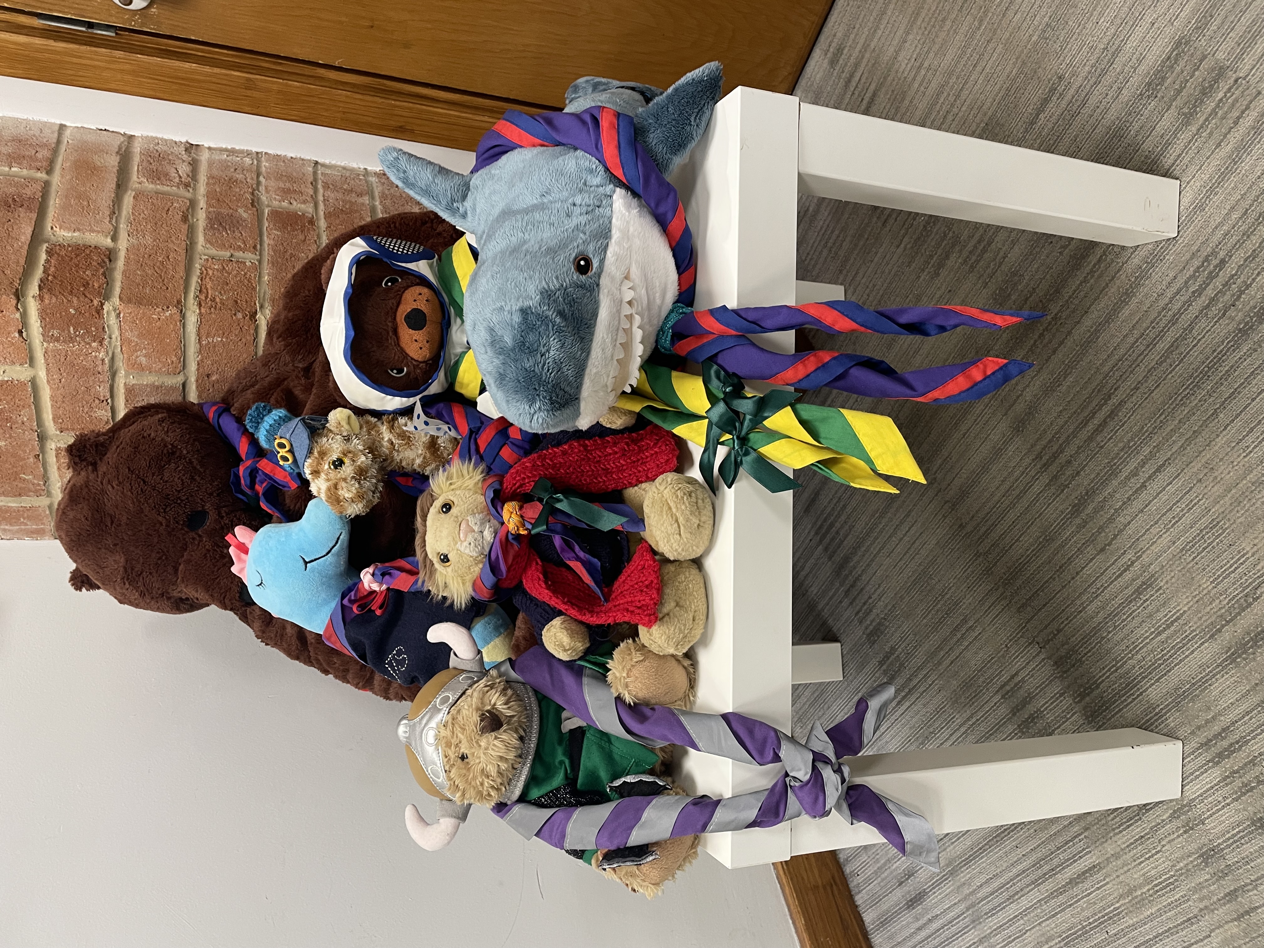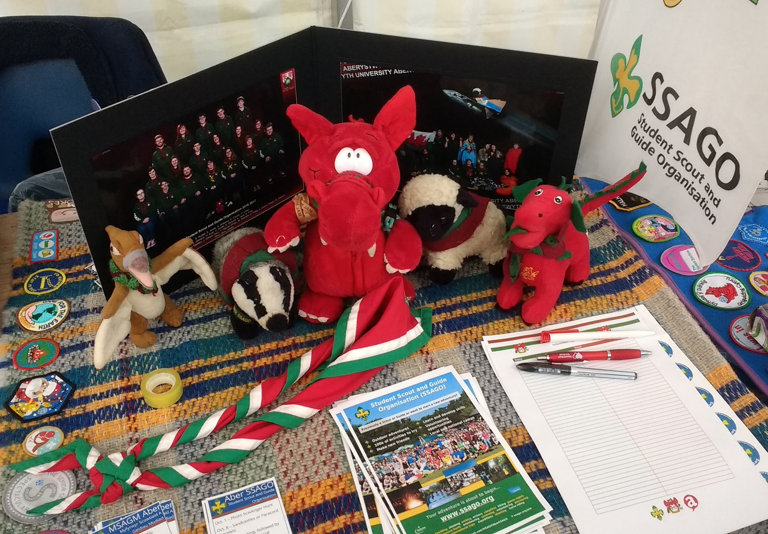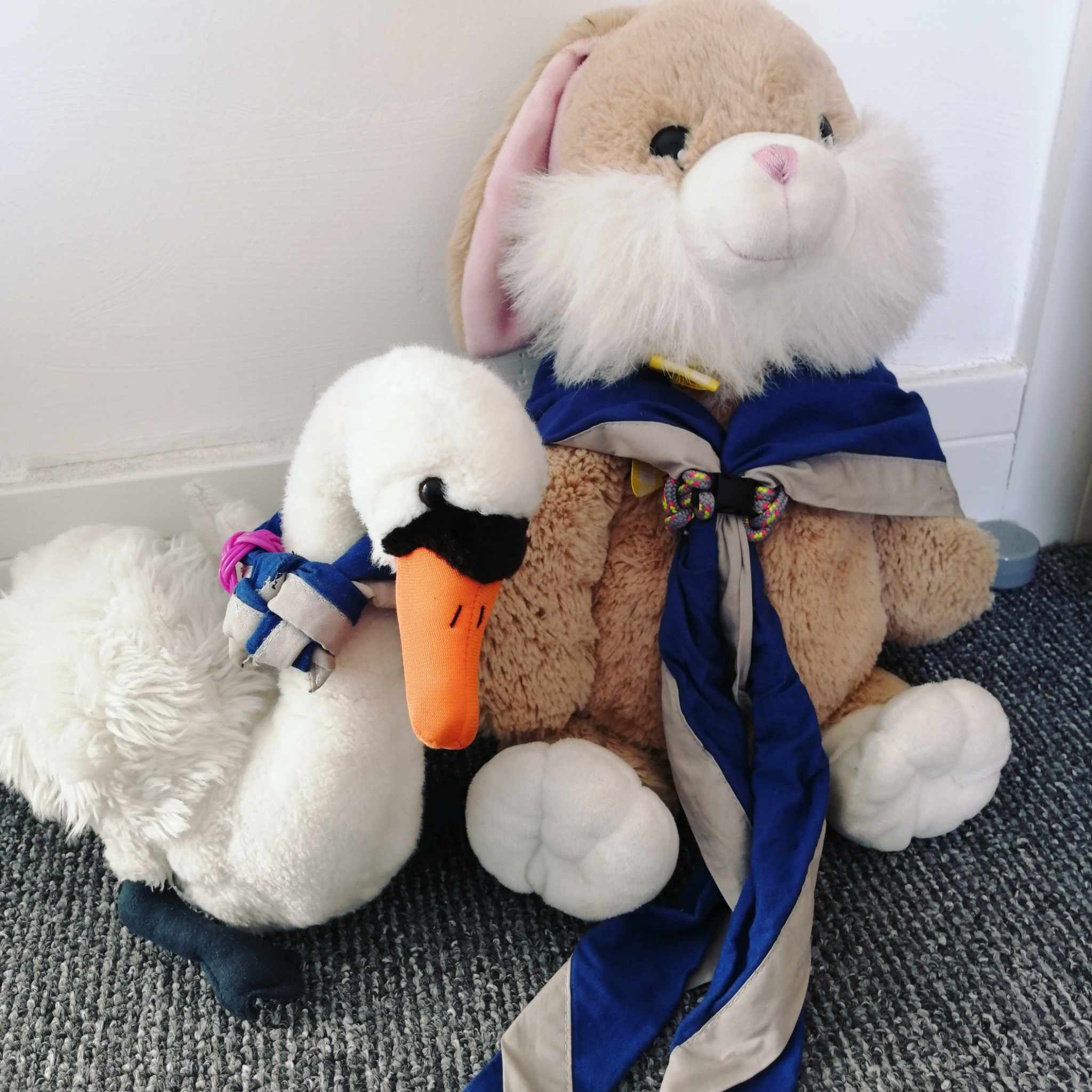 Olave (Left) is our unstealable mascot with a very cute duck Woggle Twiggle (Right) is our stealble mascot with a lovely starfish Woggle and camp blanket, displaying all 8 of our drinkers badges. |