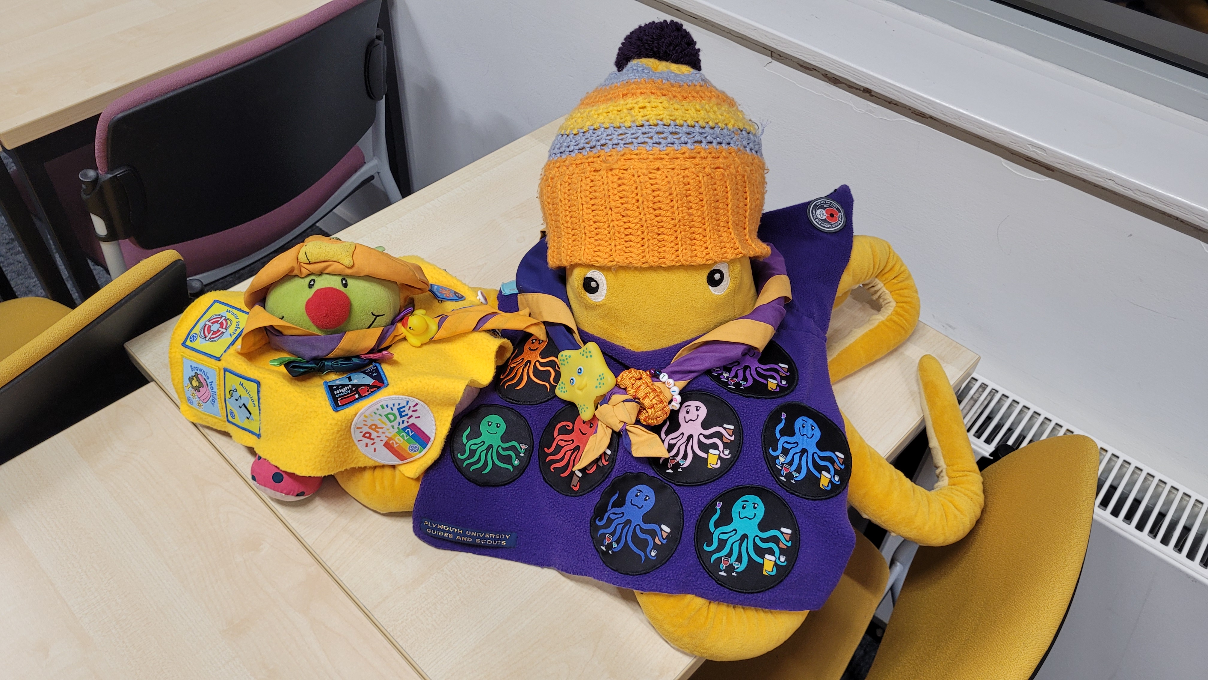 Erik the Panda (non-stealable) Erik the Panda is our society mascot. He joined the group in 1974, and has been with us ever since. He regularly comes along to meetings and on our trips. Erik's birthday is celebrated each year on Pancake Day, and due to his old age he is no longer stealable. Squid (stealable) Squid is a rainbow octopus and our new stealable mascot! They were made by our very own Elizabeth in 2019, complete with matching miniature necker. They can also be called Squidge for short. We celebrate their birthday on Halloween. |