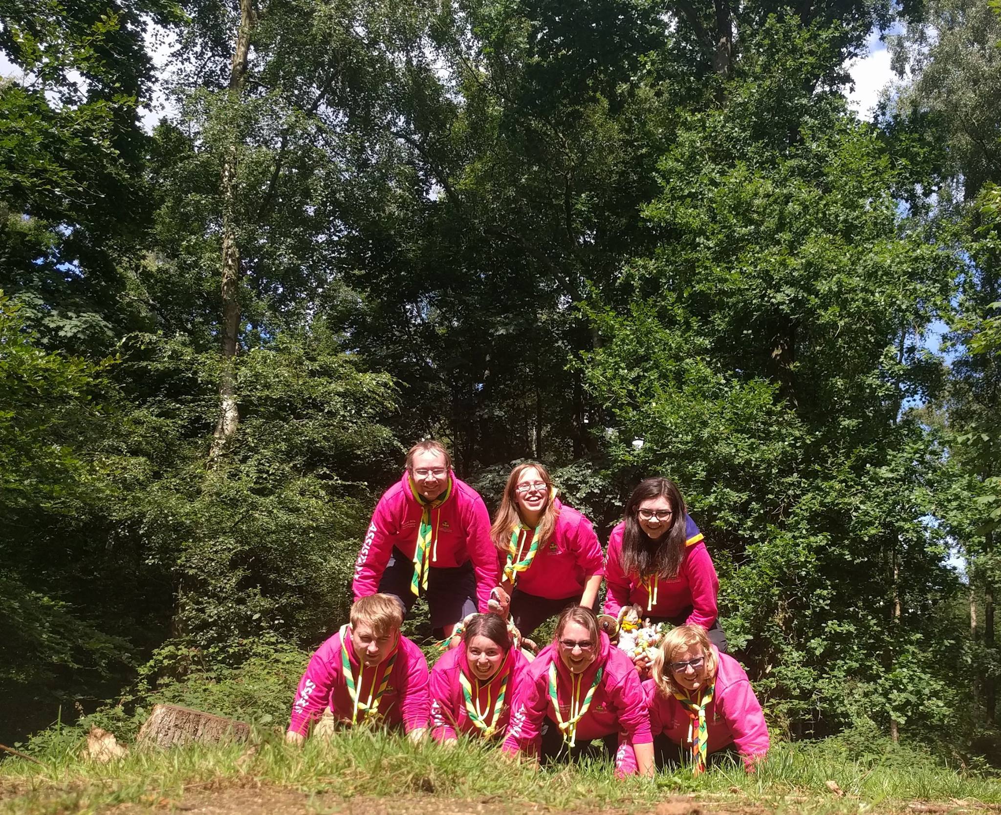 After packing down our tents (or hammocks for some) we attempted (and succeeded) a team pink pyramid including some mascots! Before leaving the site we grabbed a souvenir site badge and ice cream, Lauren in particular got excited about her unusual flavoured Calippo, Strawberry and cream mix!