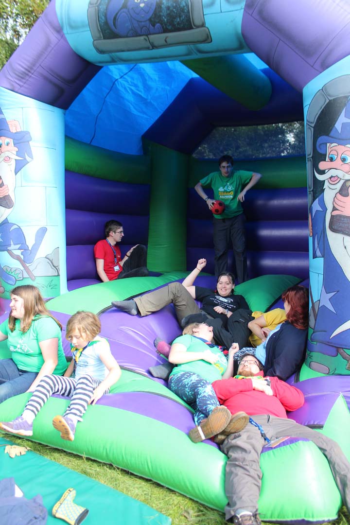 Following the tournament, people turned to enjoy the inflatables, whether fighting each other in the Sumo suits, doing the bungee run, or bouncing on the castle to show that we are still the children we always were. Behind the inflatables, The Gadaffy plate challenge took place, with Nottingham challenging the Exec to a cart race, but once again, the Exec prevailing. The village fete saw Joshua take to the stocks to receive some wet sponges and gunge while people enjoyed some table tennis, guessing the amount of badges in the jar and contributing to the SSAGO guest book and quilt.