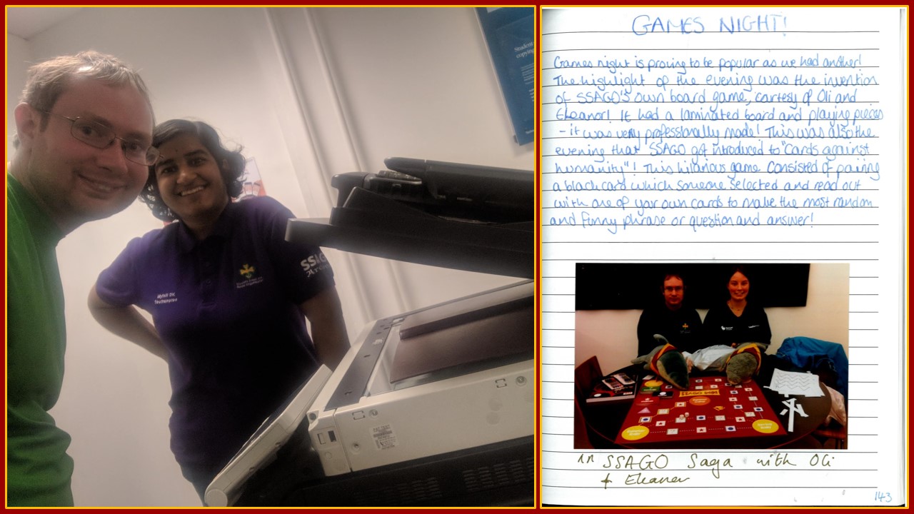 The next several weeks saw us engaged in pitched battle with the scanners. We managed to scan everything (eventually) and though the scanners were at their uncooperative best (worst), we even managed to have fun as you can see from our smiles in the photograph! Finally, in early July, the books and their contents were added to the main archives at Hartley library. The number of holes in Southampton SSAGO’s history has gone down drastically. And while we still have a long way to go, Southampton SSAGO has taken its first steps to a proper digital archive.